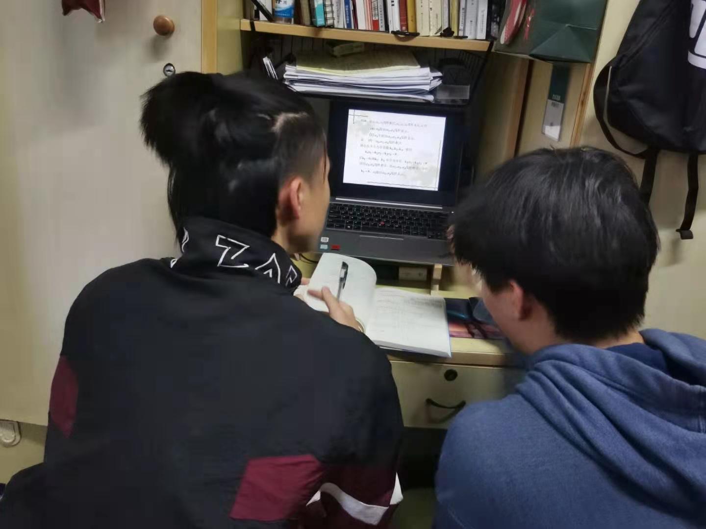 虽在疫情防控时期,但在寝室内上网课的同学们对自己的学习丝毫没有松懈,在完成专业学习之余,也利用休息时间,主动帮助学业上有困难的同学,辅导功课,解决难题。