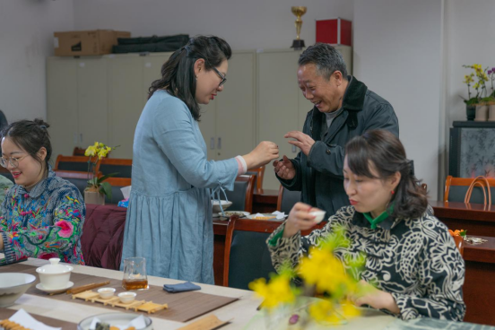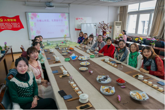 与改发办、高教所、法制办联合开展了“传承中华文化•茶香礼赞祖国”支部共建交流活动,全体女教师在德济楼508参与此次活动。