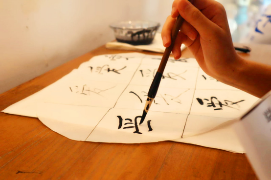 将明信片投入信箱,往下便是毛笔抒爱。新生用毛笔在一张带有网格的心形宣纸上写下“大爱”二字,与ebook漫画
