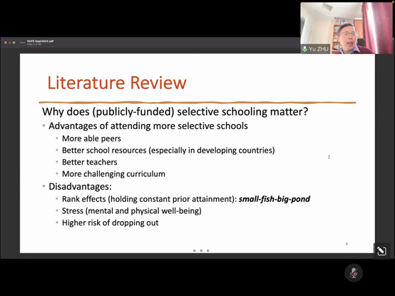 朱宇教授向大家分享了该项目研究的目的、意义与发展历程,并在世界多个国家做过该项目的分享汇报。朱宇教授倾囊相授,给学院学生、部分教师分享了该项目的研究方法、数据获取、变量因素选择以及研究结果。朱宇教授将标准化和池化模糊 RDD 策略与累积多重断点回归不连续设计 (RDD) 设置相结合,以解决资金不足的中国公共教育系统的复杂性的方法。“我们利用中国中北部一个县2010年上高中的城市学生人口的新行政数据,为就读学术性更强的高中对高风险高中毕业考试成绩的因果关系提出了新的证据。”“就研究中HSGE的高风险而言,模糊的RDD结果表明,对于处于标准渠道录取截止点边缘的学生来说,无论学校选择性程度或学校偏好如何,就读中国的精英高中并不值得。特别是,就读旗舰学校被证明对边缘学生产生了巨大且精确估计的不利影响。”朱宇教授的研究结果对学生和家长以及政策制定者具有重要意义,向广大教育工作者和学生家长传递这样一种信息:支付大量选拔费或更大量的私人学费将边缘学生送到竞争激烈的精英学校可能会适得其反。