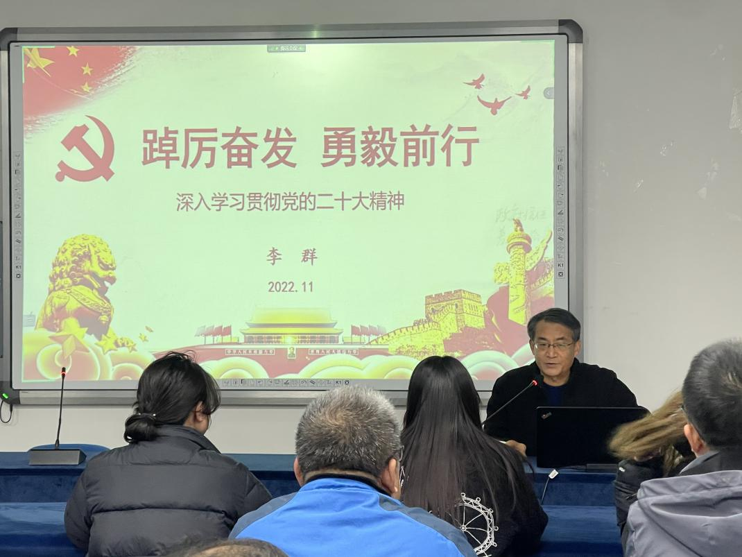 李群副校长以“踔厉奋发 勇毅前行——深入学习贯彻党的二十大精神”为题,从学习贯彻党的二十大精神,“现代化”的演进,深入推进中国式现代化、建设社会主义现代化强国,历史使命与责任等四个方面,对党的二十大报告作了深入浅出的解读。李群副校长表示,党的二十大报告立足实际、总结成就、谋划发展,内容丰富、思想深邃、亮点纷呈,蕴含着一系列新提法、新论断、新思想、新要求。要深刻领会习近平新时代中国特色社会主义思想、深刻领会党的二十大的重大意义、深刻领会党的二十大的主题、深刻领会过去五年的工作和新时代十年的伟大变革、深刻领会以中国式现代化推进中华民族伟大复兴的使命任务,并结合我校财经类高校特色,重点讲解了“中国式现代化”的历史逻辑、本质要求和前进道路上必须牢牢把握的重大原则,指出全面建设社会主义现代化强国是一项伟大而艰巨的事业,前途光明,任重道远,务必不忘初心、牢记使命,务必谦虚谨慎、艰苦奋斗,务必敢于斗争、善于斗争,坚定历史自信,增强历史主动,奋力谱写新时代中国特色社会主义更加绚丽的华章。
