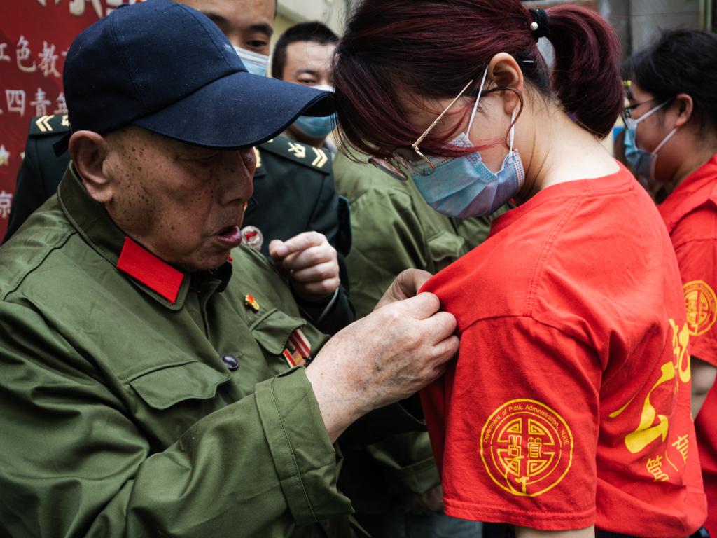 “看着这些岁月变迁中坚强无畏的老人们,真的让我感慨很多。在他们为我佩戴团徽时,我仿佛与曾经年轻的他们达成了约定,约定也要像他们一样,为国家燃烧自己的光和热。而身为新时代的青年,我们应当从现在做起,将五四精神深深镌刻在心中,珍惜青春年华,不断充实自己,为日后为国奉献打下坚实基础,只有这样才不负青春,不负韶华。”公事管2101班的姚瑶同学在活动结束后这样说。