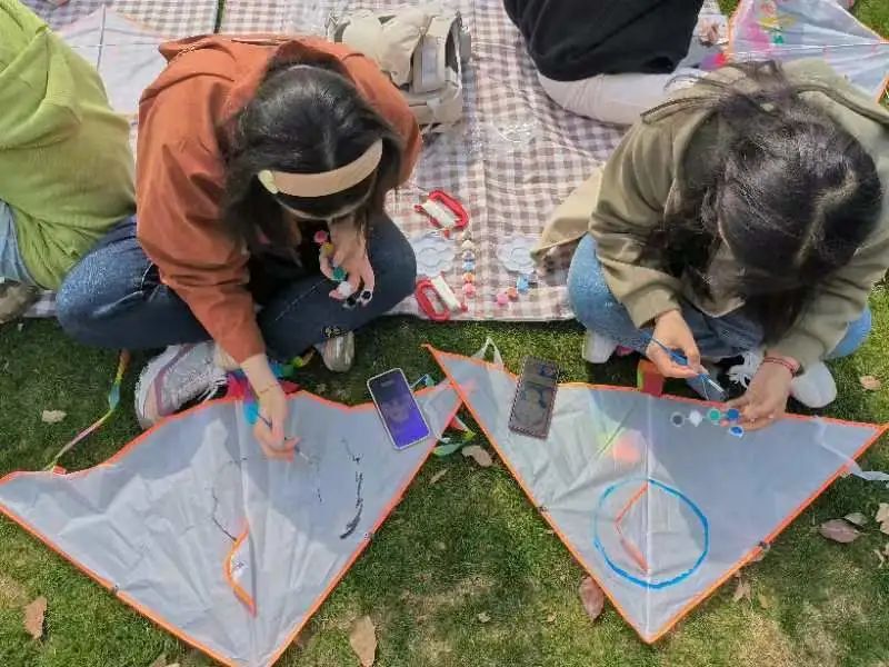 学生会负责人提前在羊山公园进行了活动地点的环境踩点,并铺好野餐垫,完成了场地布置,为同学们进行风筝绘画做好了准备。当天下午,同学们一起来到了羊山公园。大家围坐在野餐垫上,一人一组或两人一组开始了天马行空的想象和创作。有人照着手机小心翼翼地在风筝上描绘,画上自己喜欢的角色;有人则自信地打开颜料盒大笔挥画,让色彩在缤纷的世界里自由碰撞;也有人在风筝上书写愿望或是生活中所遇到的烦恼,希望心愿能够实现,而烦恼可以随春风一同扬升消散。