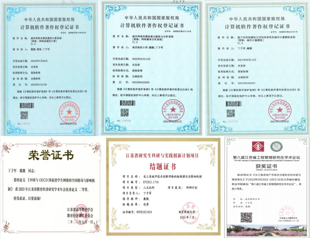 丁子军同学读研期间认真学习、潜心科研,围绕创新网络和区域发展方向,以本人一作或导师一作、本人二作身份在地理学报、资源科学、资源开发与市场等核心期刊发表论文5篇。作为项目负责人以优秀等级完成江苏省研究生科研创新计划项目,并深度参与了戴靓老师的国家自然科学基金青年和面上项目等。此外,也取得国家软件著作权3项,多次参与国际国内学术会议并进行汇报,获得“2023年江苏省教育经济研究学术年会”优秀论文二等奖、“第八届江苏省工程管理研究生学术论坛”优秀论文三等奖。