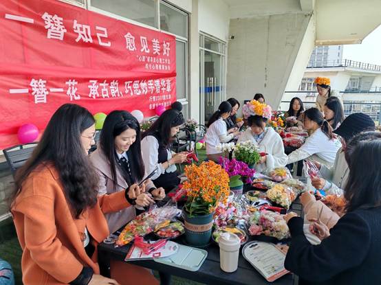 伴随着音乐的缓缓流淌,老师们沉浸在手工制作的乐趣中。阳光天使团的同学在一旁细心协助,现场氛围温馨而融洽。一朵朵艳丽的鲜花,在老师们的巧手下,变成了独一无二的艺术品。
