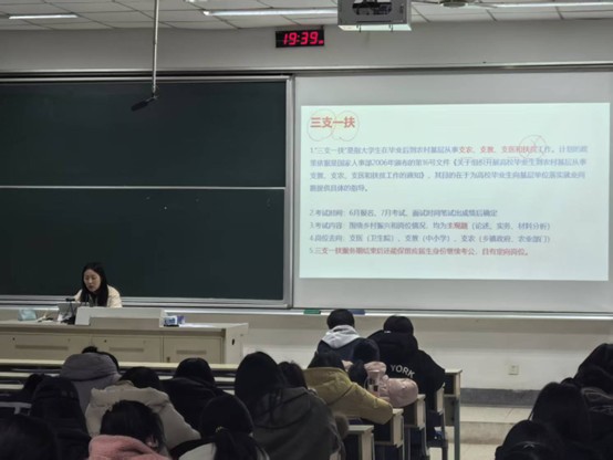随后,张一萌为大家讲解了我国公职人员的薪资结构,这是职业选择中最受关注的问题之一。她还详细介绍了公务员的报名与考试流程,并结合往年的招录和报名数据,帮助在场同学更清晰地了解考公现状。