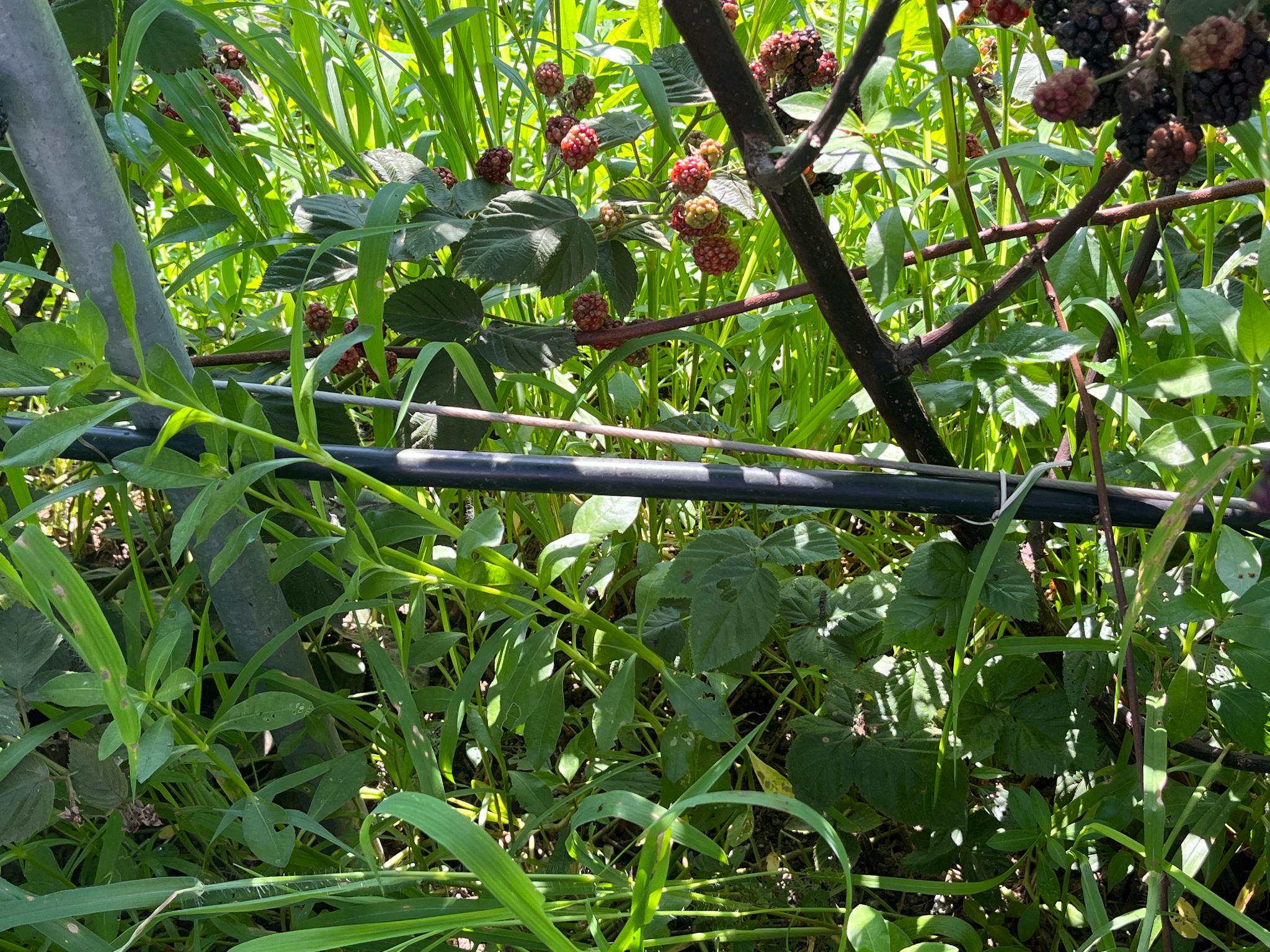 实践当天,团队成员在基地负责人张老师的带领下深入黑莓种植区。炎炎烈日下,小组成员发现黑莓植株分布均匀,种植布局让每一株黑莓都充分晒到太阳。同时经张老师介绍,种植区灌溉水管有序铺设。据负责人介绍,干旱高温是种植中最常遇到的气候问题,其灌溉系统应对当地高频干旱高温气候的关键设施,完善的灌溉系统能有效减少减产风险。