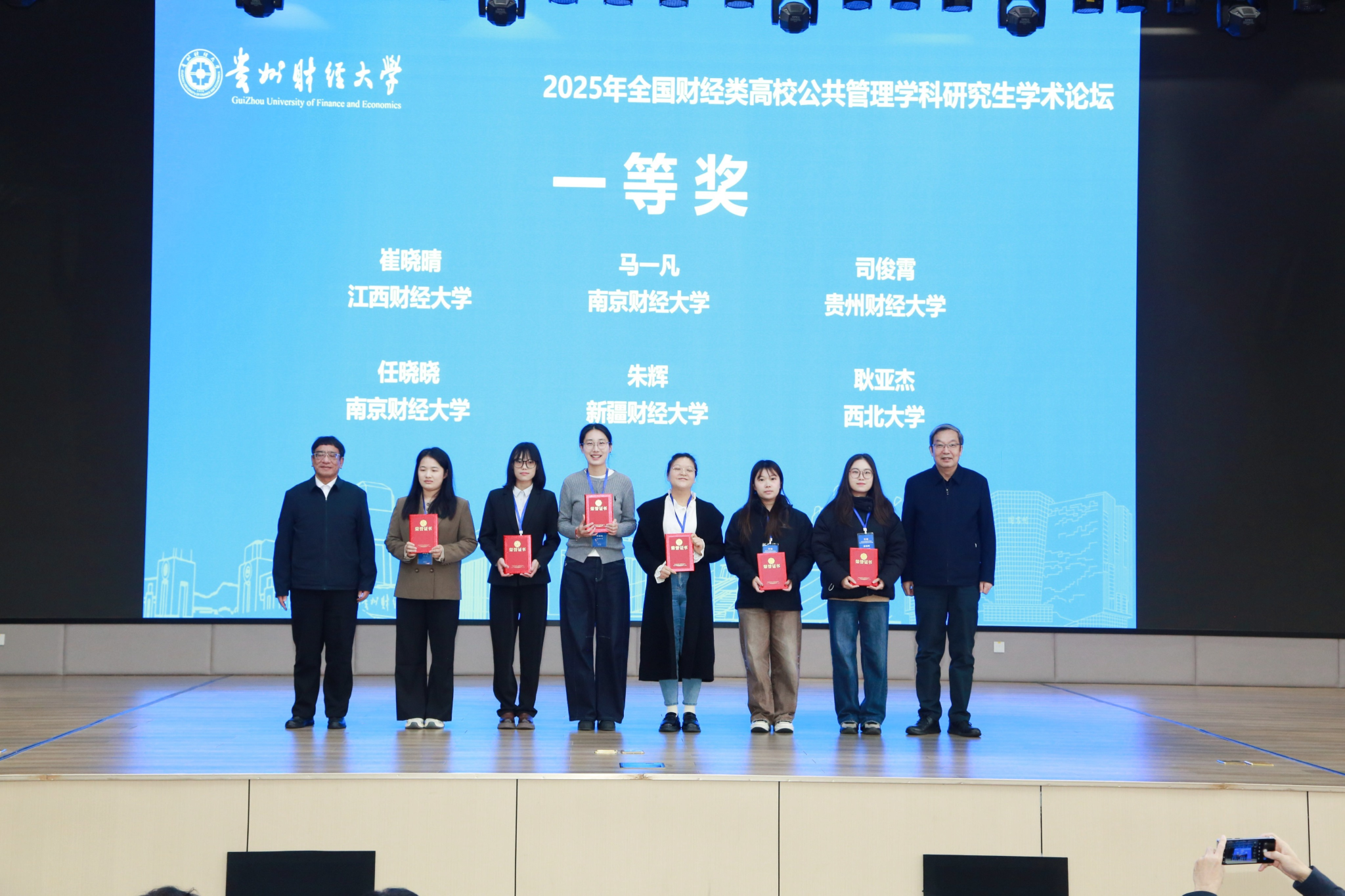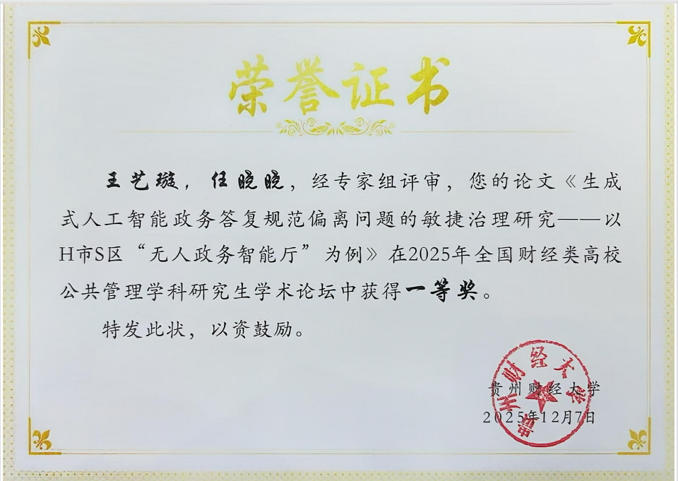 马一凡、任晓晓两位同学的研究成果获得评审专家一致认可,荣获一等奖,为学院赢得了荣誉。论坛一等奖由国务院公共管理学科评议组联合召集人丁煌教授和贵州财经大学党委书记缪坤和教授颁发。