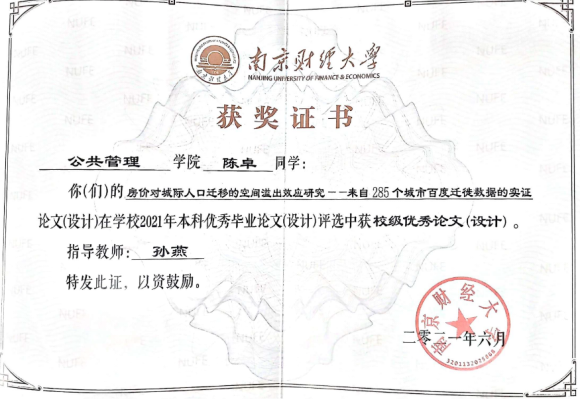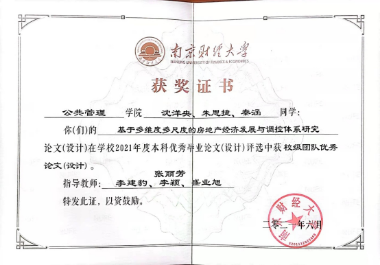 2017级房地产开发与管理专业学生陈卓的毕业论文“房价对城际人口迁移的空间溢出效应研究——来自285个城市百度迁徙数据的实证”(指导老师:孙燕)在ebook漫画 2021年度本科优秀毕业论文评选中获得校级优秀论文;沈洋央、朱思捷、秦涵等同学的论文“基于多维度多尺度的房地产经济发展与调控体系研究”(指导老师:张丽芳、李建豹、李颖、盛业旭)获校级团队优秀论文。