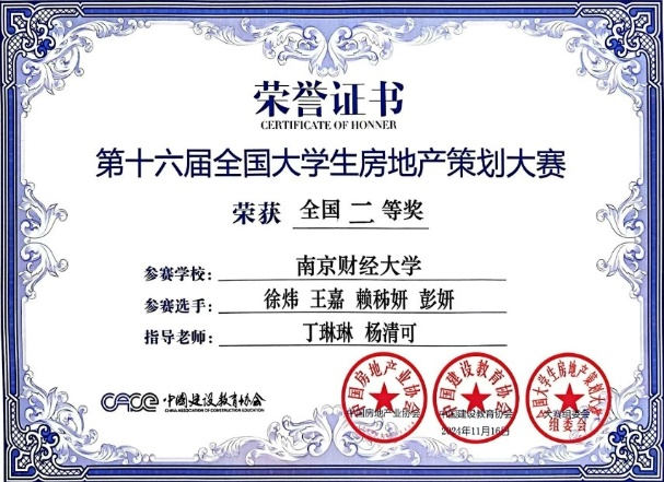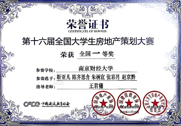 11月16日,2024房地产与物业管理产学研创新峰会暨第十六届全国大学生房地产策划大赛总决赛在首都经济贸易大学举行,经过两轮角逐,我中心选送的参赛作品《建海者-建一座“幸福海“》(成员:靳亚凡、陈齐思含、朱柄宣、张彩月、赵京黔;指导教师:王君櫹),荣获全国一等奖;参赛作品《新风逸巷》(成员:徐炜、王嘉、赖秭妍、彭妍;指导教师:丁琳琳,杨清可),荣获全国二等奖。