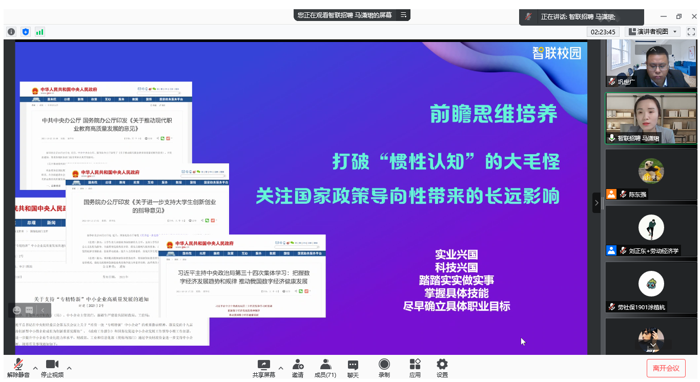 会议中,马潇珺总监通过丰富的就业数据,从供需两端剖析了当前劳动力市场就业形式,指出目前就业市场存在着“岗位供需错配、行业供需错配、招聘难与求职难并存”等问题,新一线城市的集聚效应不断增强,女性力量正在觉醒。建议我们在求职过程中既要看重眼前薪酬福利,也要注重长远的职业规划,特别是要结合宏观政府政策,关注国家政策导向性带来的长远影响。同时还对互联网、金融业、新能源领域以及高端制造业等行业的就业情况进行详细解读。建议我们要打破认知牢笼,不能仅盯着“考研、考公、考编”的独木桥,更应关注“专精特新”等、高端制造、新能源等“小巨人”企业。讲座之后马总又解答了现场同学的疑问,进行了良好的互动。