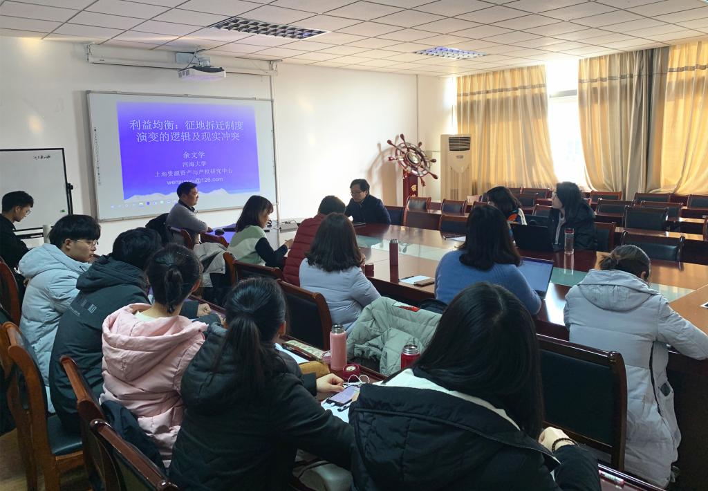 1220日下午,应ebook漫画 邀请,河海大学ebook漫画 余文学教授在我校仙林校区德济楼508会议室作了题为利益均衡:征地拆迁制度演变的逻辑及现实冲突的讲座。ebook漫画 部分老师和研究生参加讲座,讲座由ebook漫画 副院长李永乐主持。