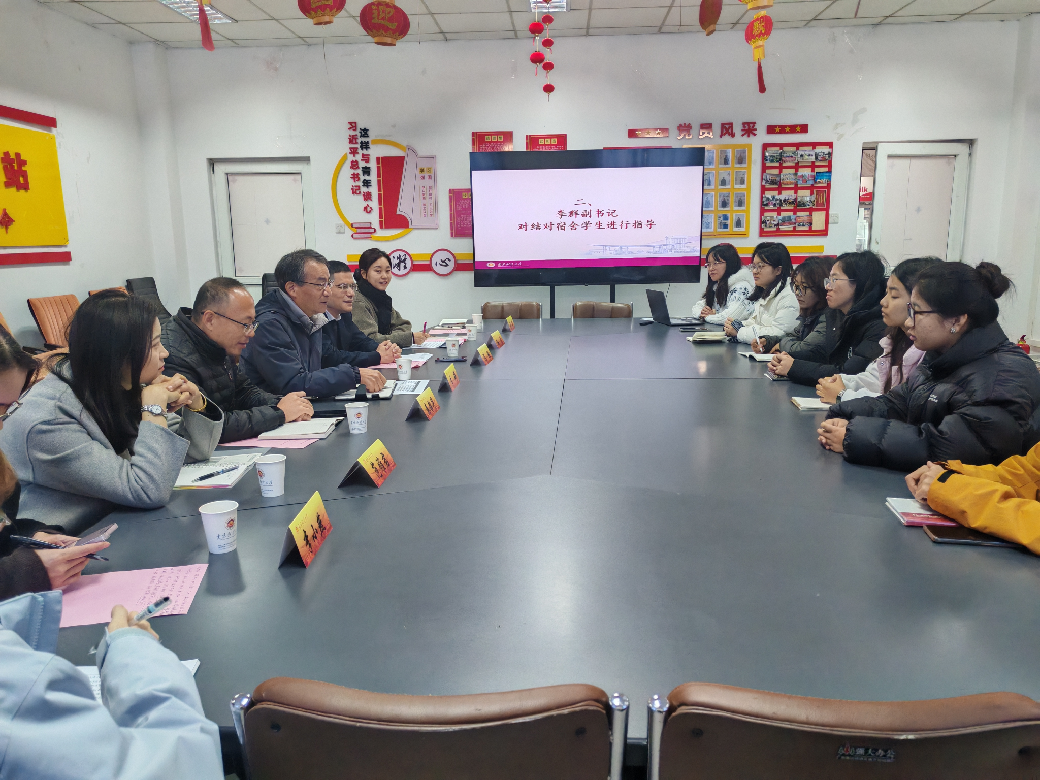 座谈结束后,李群副书记听取本科生党支部书记作的工作汇报,并对进一步高质量推进支部工作提出三点意见。一是强化思想引领,深学细悟习近平新时代中国特色社会主义思想,紧扣党的二十届四中全会精神,筑牢理想信念根基;二是打造学院支部特色品牌,积极创建党建亮点品牌,树立学院特色形象,凝聚支部党建力量;三是发挥党员先锋模范作用,立足学生党员特点,推动党建、学业发展与志愿服务深度融合,以党建引领赋能学生成长成才。