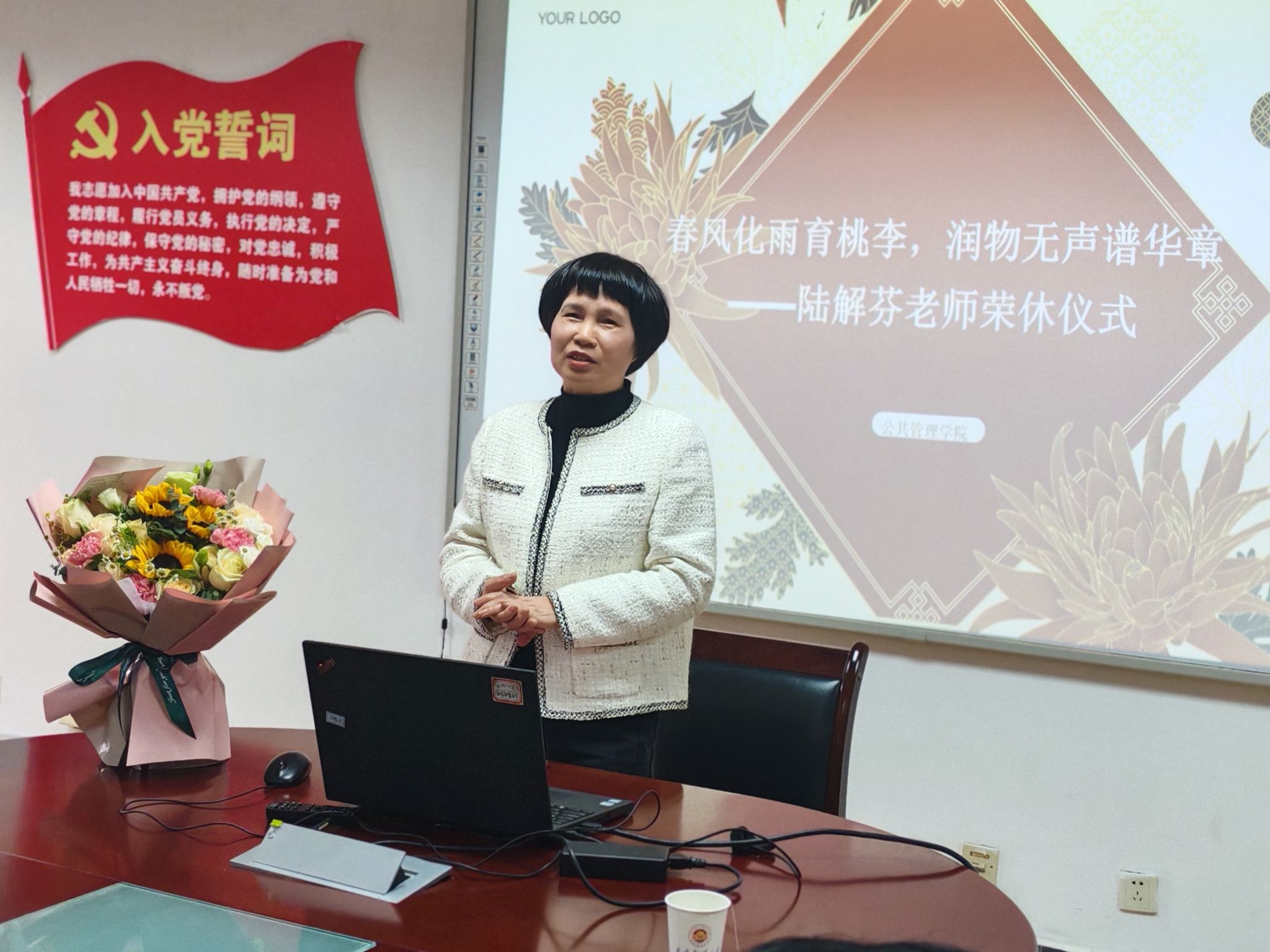 在热烈的掌声中,陆解芬老师发表荣休感言。她回顾了自己在学院的工作经历,对学院和同事们的关心和支持表示感谢。虽然即将退休,但她对学院的感情不会改变,对教育事业的热爱不会减退。她希望学院在未来的发展中能够取得更大的成就,并表示在退休后愿意继续为学院的发展贡献自己的力量。